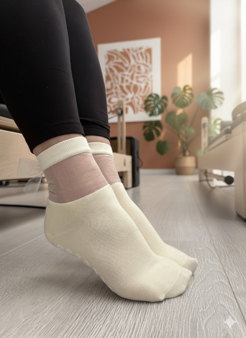 ౨ৎ Signature rose-pattern sole ensures reliable, non-slip grip on mat, reformer, or floor